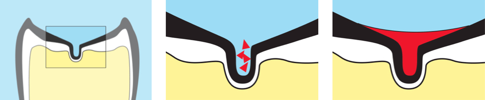 A híg anyag végigfolyik a barázdák mélyén, a polimerizációs lámpa fényére összeköt a zománccal, és ezzel roppant erős, stabil védőfelszínt alakíthatunk ki.